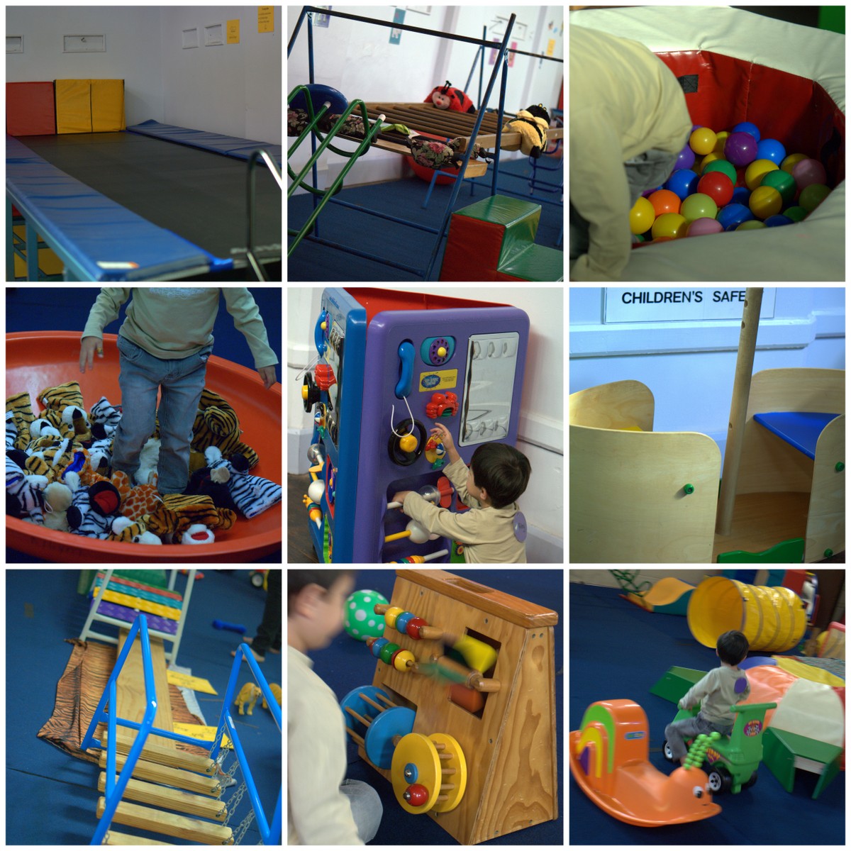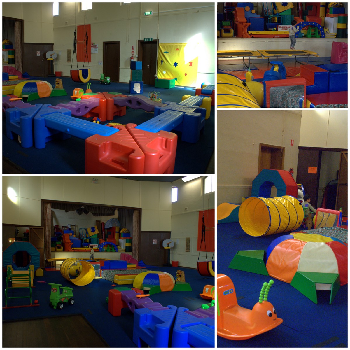 The back room is another large play area with a big trampoline and as you can see, more equipment to climb, balance, swing, ride, jump, hang and play in.
