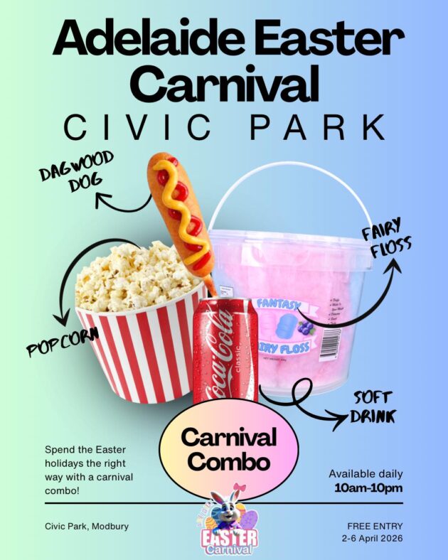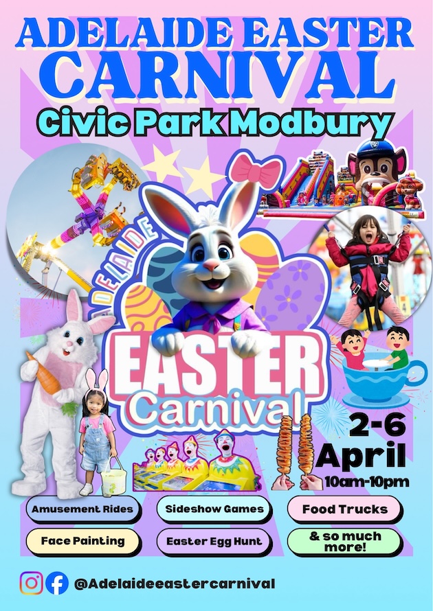 The carnival promises to be a fun-filled day of Easter celebrations in beautiful Civic Park in Modbury. Take your family and friends along as you search for hidden treasures in the Easter Egg Hunt, show off your skills in the colouring competition and kids can get their face painted. Have a photo with Easter bunny and enjoy the carnival atmosphere with a large variety of rides catering for toddlers to thrill seekers, games, carnival foods and more.