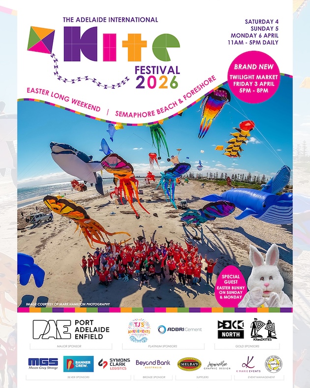 Adelaide International Kite Festival 2026 – Watch the sky fill with colour, twists and twirls, kites of all shapes and size – when the Adelaide International Kite Festival returns to Semaphore Beach over the Easter long weekend.