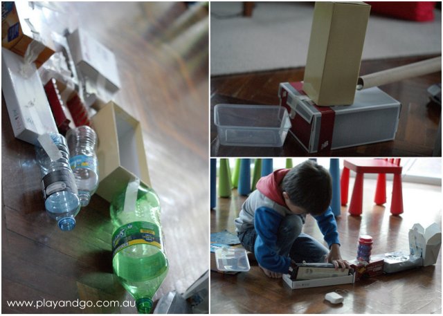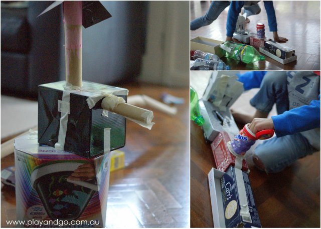 One afternoon my 5 year old told me he wanted to ‘make somefink’ and really needed some boxes. Considering it was nearly bin night we had plenty of recycling piled up and our house seems to accumulate ‘stuff’ that I might consider to be rubbish… but other little people seem to treasure around here. So, the first part of the game was to go and find anything that he could use for making something. He looked in each room and also in our recycling and built up a pile of ‘stuff’ as you can see in the pic above. Each item found was added to the pile with much enthusiasm and his little face beamed with pride at this great haul of treasure.