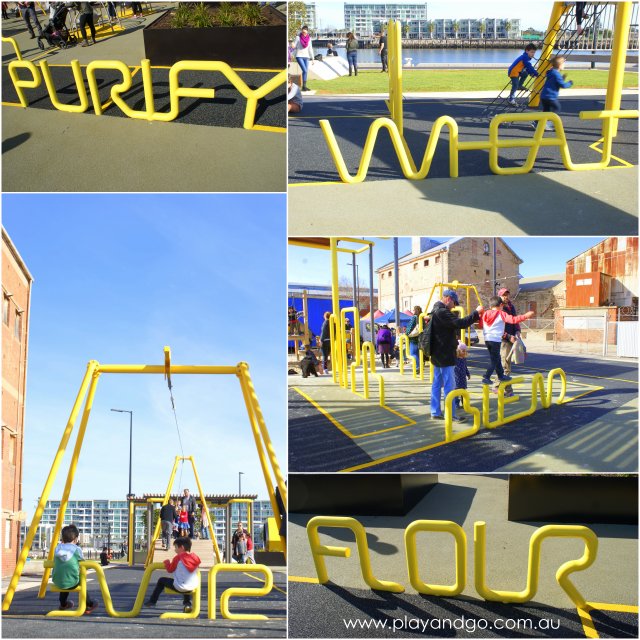 You’ll find reminders of the longest continuously serving flour mill in South Australia (which operated from 1855 to 1980), cleverly scattered throughout the playground. Children who can read may like to make a game of finding and deciphering the words, as well as enjoy climbing and balancing on them.