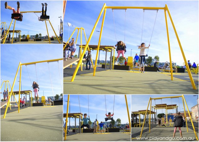 The long length of the swings means with a bit of pushing you can fly high through the air. “Higher” you’ll hear them call.