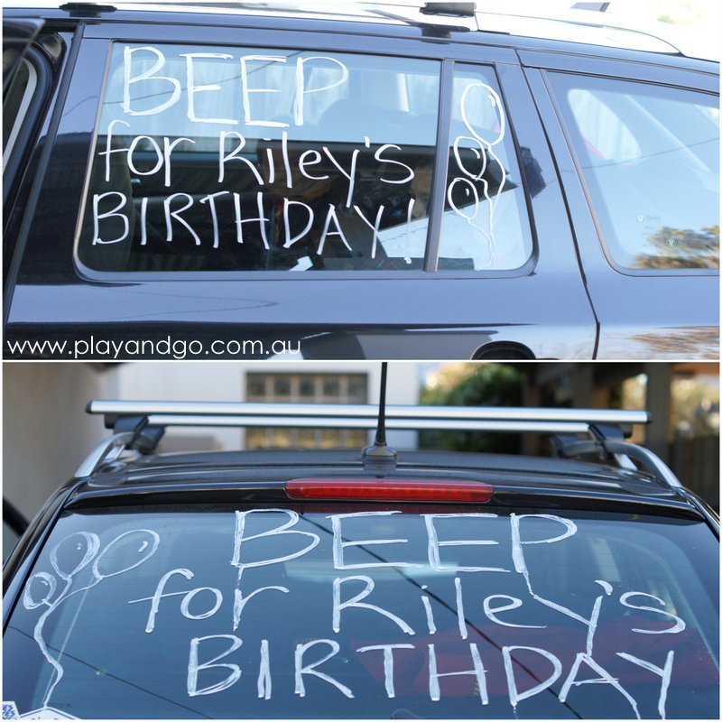We asked people to ‘Beep’ for the Birthday child. I got a thick chalk marker from Officeworks and wrote on the car windows (back and sides) the night before, so it was a surprise when they got to the car in the morning. As the Birthday boy is not in the car for very long each day, we kept the writing on the car for the week. He was thrilled each time he got a Beep! Thank you to everyone who ‘Beeped’ – it was so much fun!