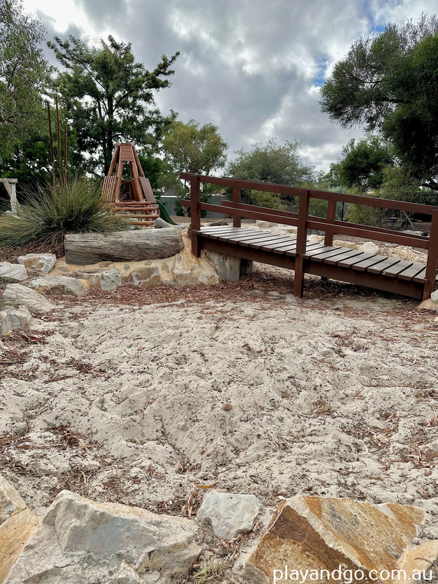 Just outside of the basin is a water play area with a pump, stone channel and sand pit. A wooden bridge crosses the sandpit in the middle.