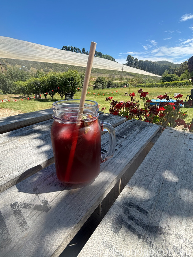 The setting is absolutely lovely and there are so many places to sit down and enjoy a sweet treat. There is seating indoors and outside under the vines and shade cloth, plus tables, chairs and umbrellas dotted all over the lawn. There is also plenty of green grass space to plonk a picnic rug. There is a cabinet filled with cakes, fresh fruit blended ice cream and a selection of drinks including Verso L’Alto coffee, smoothies, warm drinks and a very delicious organic cherry berry iced tea. Right next door to the café is a table set up where you can purchase cherries to take home which are priced based on variety, size and amount.