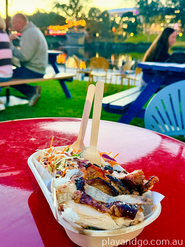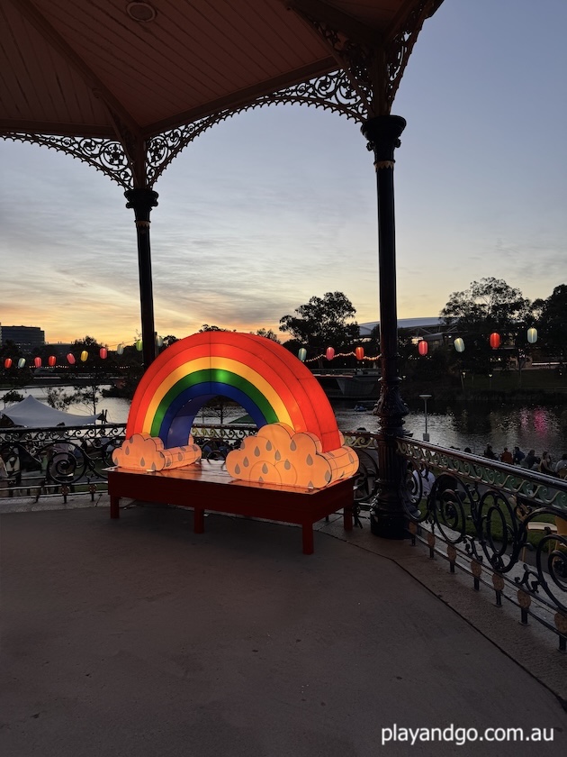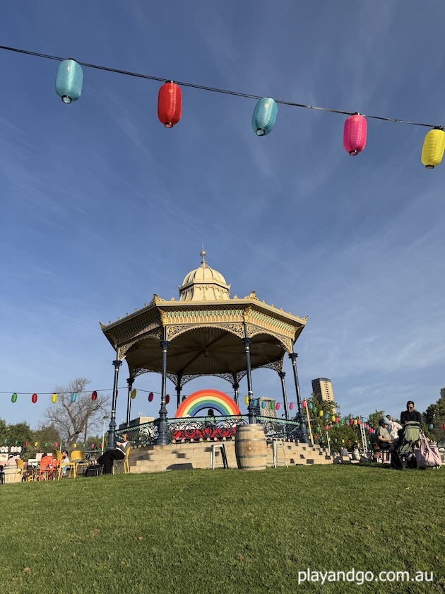 - sun protection for during the day eg hats, shirts, sunscreen – while there are multiple shade structures (umbrellas over tables and a tent, Elder Park is in full sun during the day.