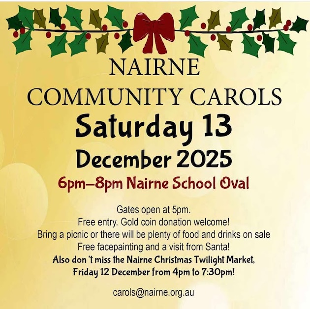 The Nairne & Districts Residents’ Association is delighted to announce that the Nairne Community Carols for 2025 will be held at the Nairne School Oval on Saturday 13 December. Take along a picnic or food and drinks will be available to purchase.