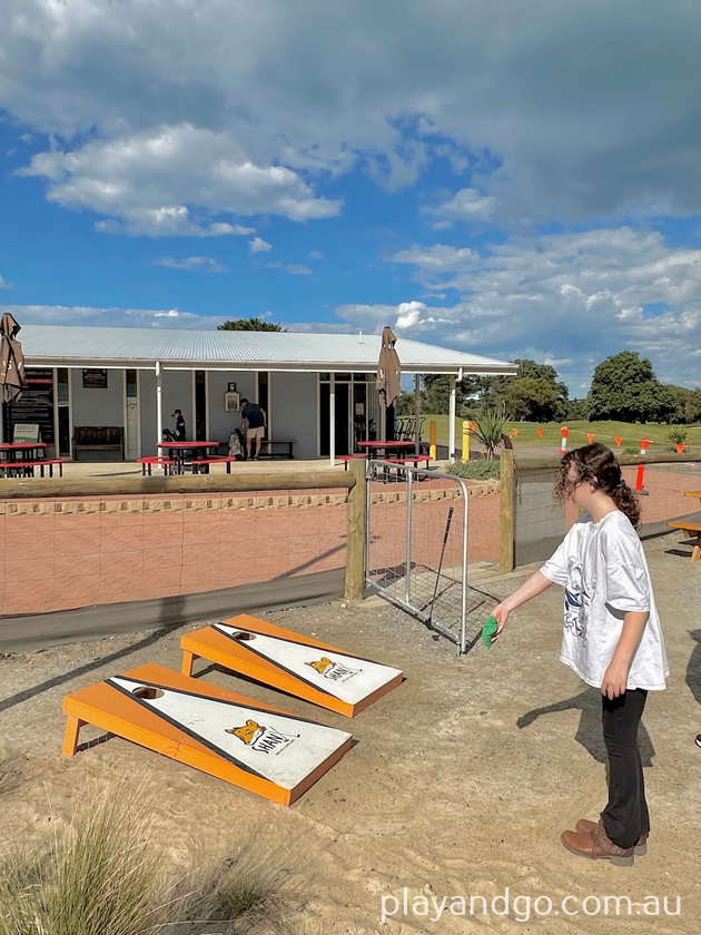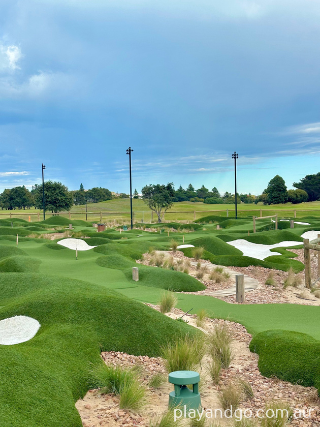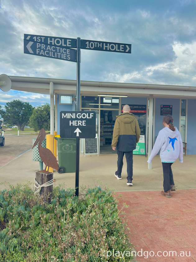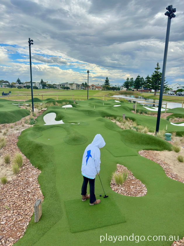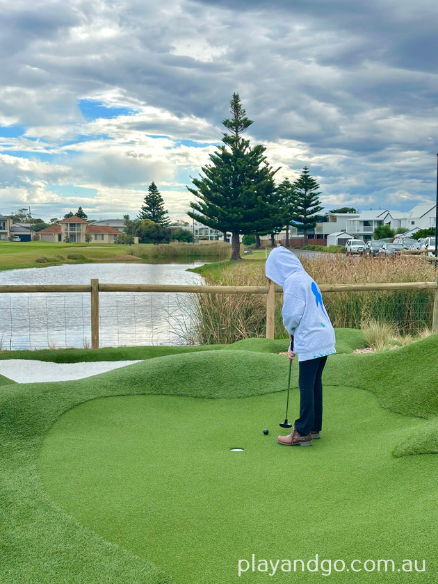 The course is easy to navigate, with wooden plank pathways leading from one hole to the next. While playing, you’re surrounded by the bigger golf course and a scenic lake. There was a black swan swimming around when we visited, and if you’re lucky, you’ll also hear the “toot toot” of the Cockle Train nearby.