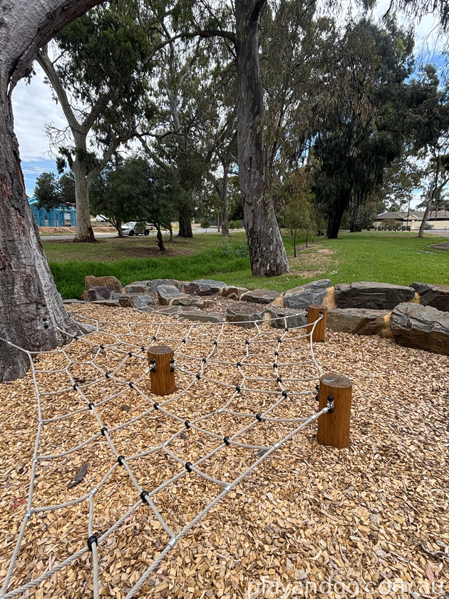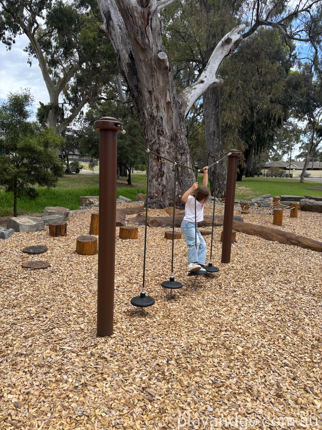 Once you have filled up your stomach and had your coffee fix if you head outside, turn right and follow the path you will find yourself at Ridgehaven Reserve. This playground isn’t huge but it has enough equipment for the kids to burn off some energy and it’s a lovely spot next to a creek, surrounded by trees. There are two slides for small children with sturdy stable steps easy enough for them to climb. There is also a small window for children to enjoy some imaginative play using the bark chip ground cover as food items. There is a large swing to accommodate a few children at a time, some wooden stepping stones, monkey bars and some climbing nets for bigger kids to enjoy.