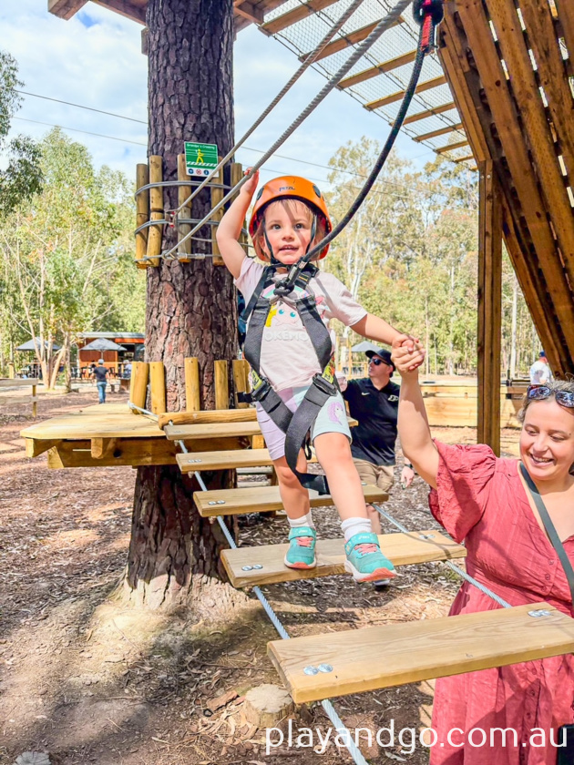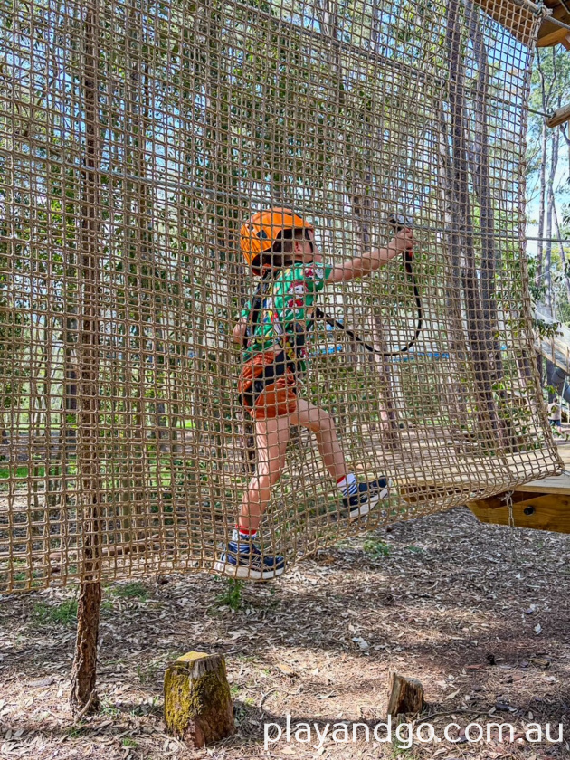With the mini course tickets, you have the option of adding on a nets adventure. This is a suspended playground up in the tree tops which is fully enclosed for safety. Adults are complimentary with kids under 6 years old so you can accompany the young ones. There are bridges, bouncy nets and a tube slide and the flexibility to go between the nets adventure and the kids or mini course. Due to being fully enclosed, kids don’t need to wear safety harnesses, helmets or gloves in the nets adventure.