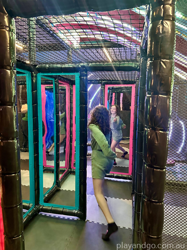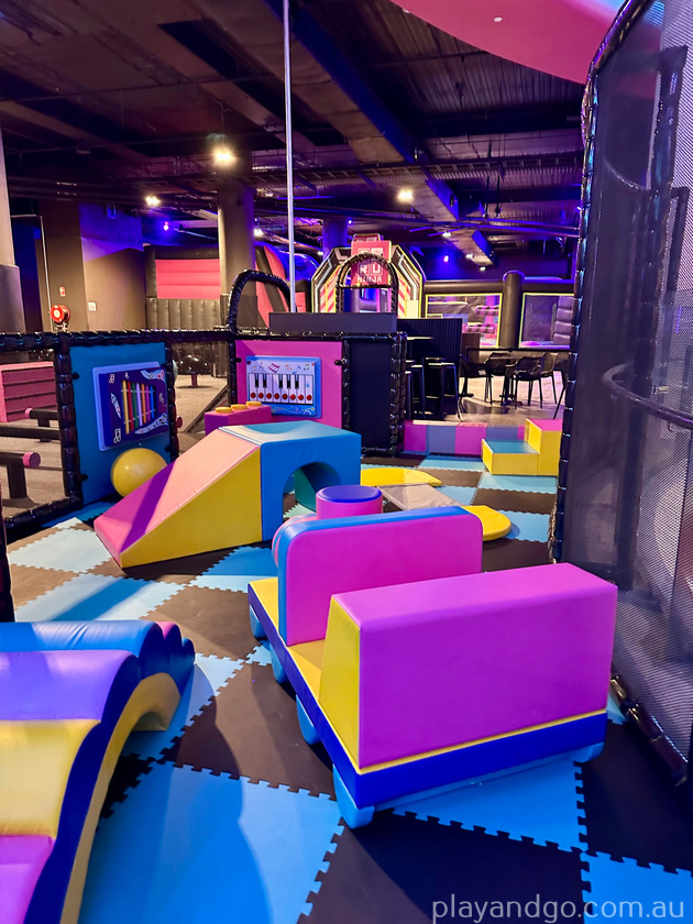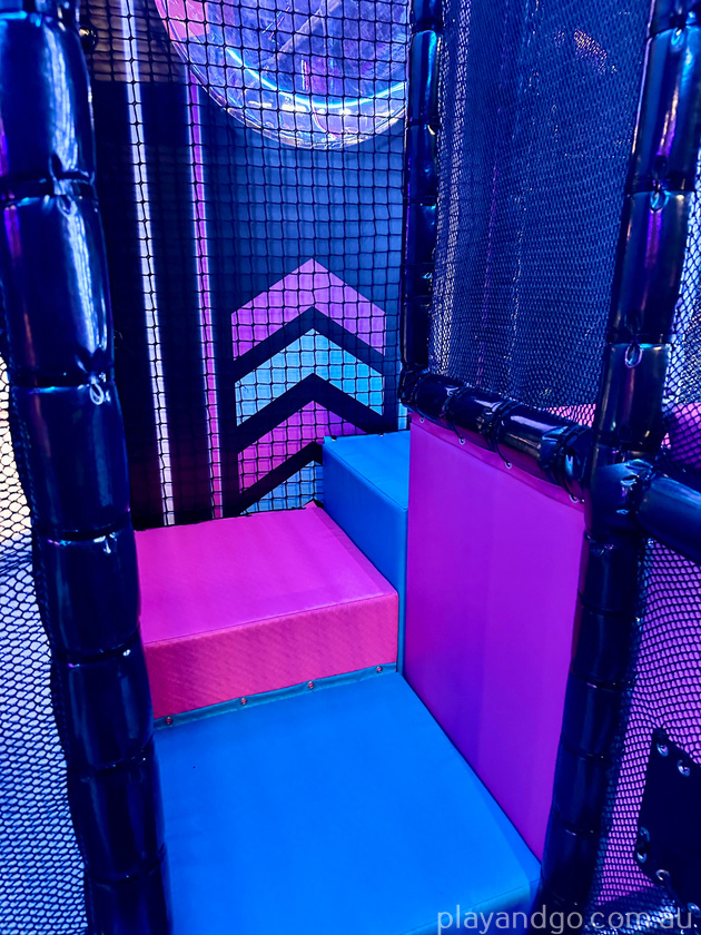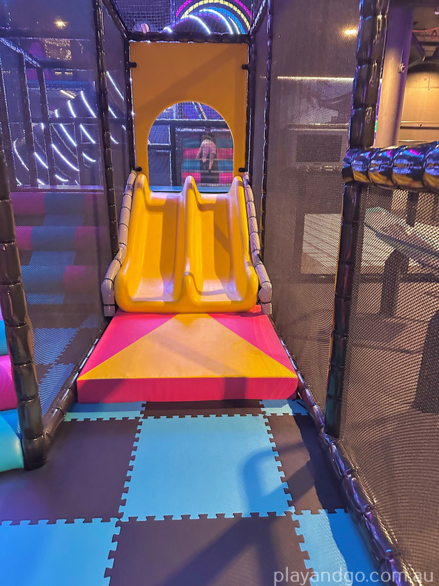 For smaller kids, there is a dedicated playground that includes smaller ninja warrior obstacles, multiple levels, crawling tubes and some amazing slides with flashing lights.