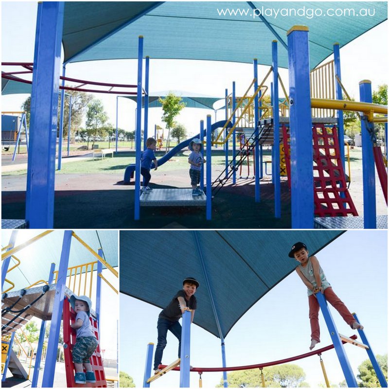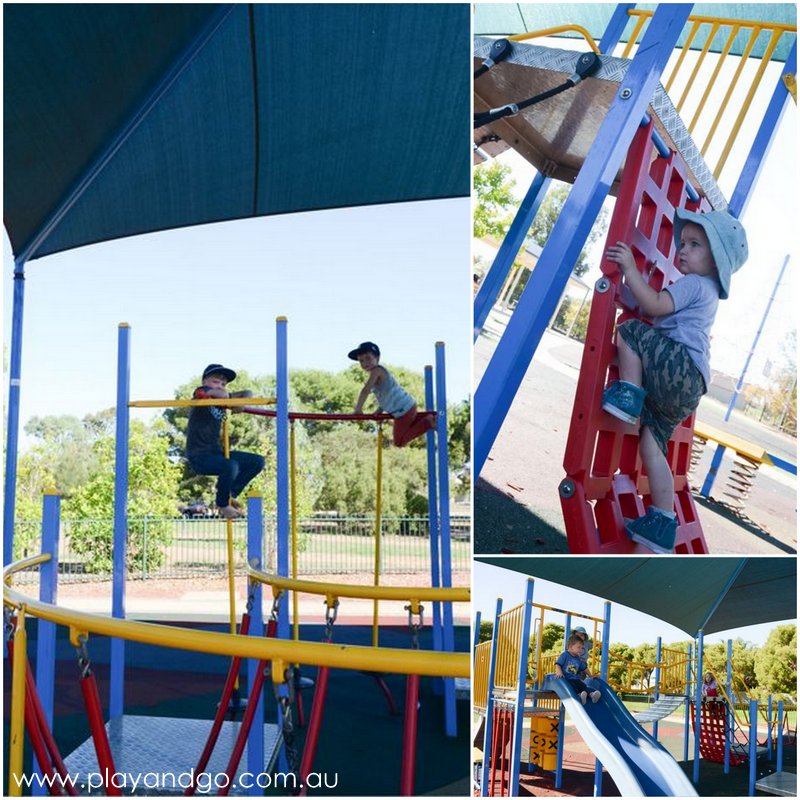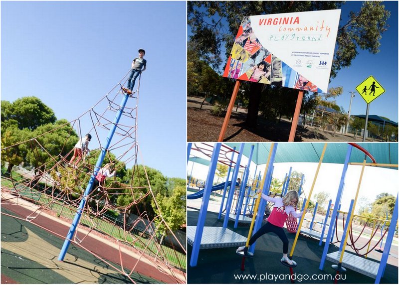 Strangely enough, this gem of a playground at Virginia (about 30kms north of the Adelaide CBD) is actually a big hit with two women – one who lives an hour south, one who lives an hour north! It has often been the brilliant half way meeting point to spend time nattering away while our kids play. On the day of this review, we clocked up FIVE HOURS with five kids (aged 2 to 9) running and climbing while we got to catch up.
