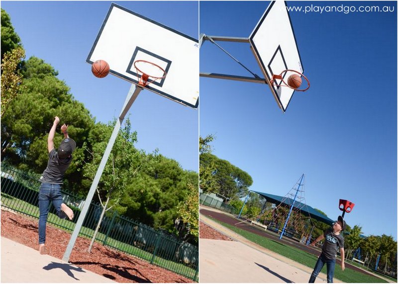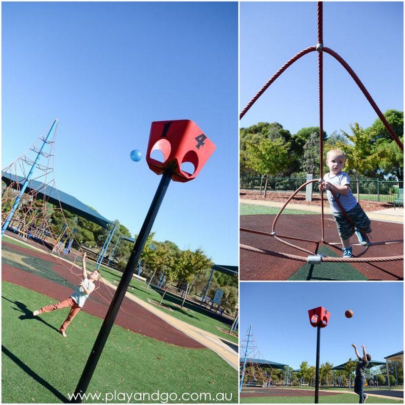 There’s climbing and play equipment suitable for toddlers, like the slippery dip, see-saws, rockers and a bridge. Big kids will be very entertained by the HUGE scramble net pyramid (which might give parents a fright when they make it to the top!) that seems to be pretty safe, as well as a basketball court and another ball throwing basket to aim for.