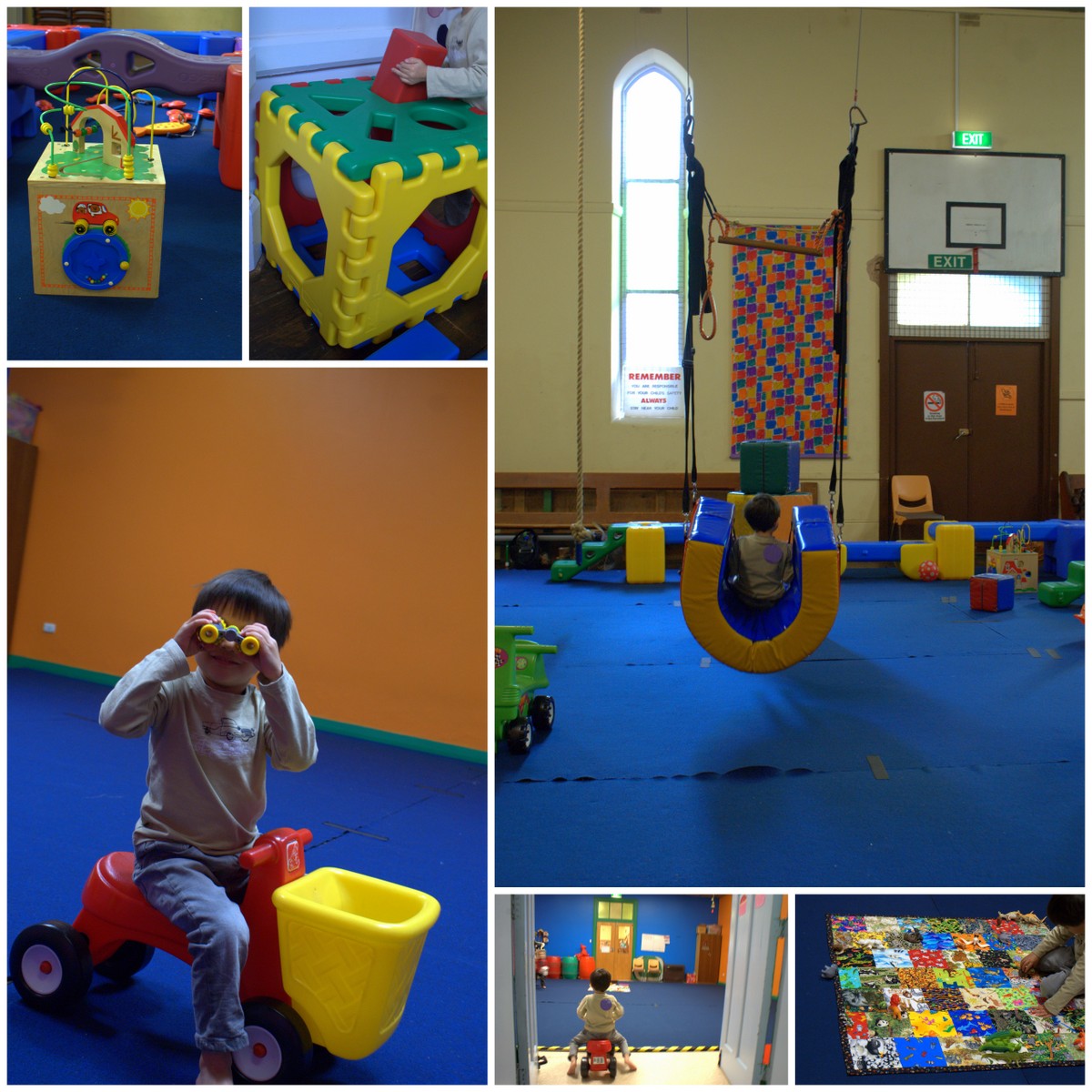 The pictures above show the big front room at Unley where you can leave strollers, shoes and bags along the side. All children must have shoes and socks off for safety. The play equipment gets changed around every week to make things interesting. For example the big U-shaped swing below is sometimes a bucket seat swing while other times it’s trapeze rings with a run up ramp (my son’s favourite). The toys and activities change to match the current themes for the term and involve the children in all sorts of different skills, helping them develop their fine and gross motor skills and encourage problem solving.