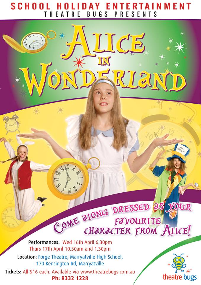 Showbugs students from Theatre Bugs present a musical version of Alice in Wonderland for all to enjoy during the Easter school holidays. Come along dressed as your favourite Alice in Wonderland character. Tickets are $16 each.